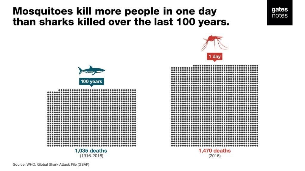 Nos preguntan por el animal más letal y respondemos: «El tiburón». Pero los mosquitos matan a más personas en un día que los tiburones en los últimos cien años.
