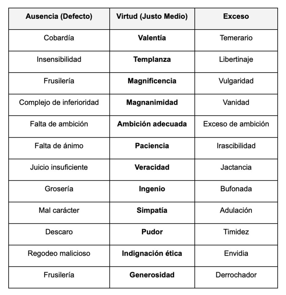 Para alcanzar la virtud, Aristóteles compartió un atajo: el justo medio. La virtud no está en los extremos, sino en el equilibrio entre el vicio por exceso y el vicio por defecto. La valentía es la virtud entre el vicio por defecto de la cobardía y el vicio por exceso de la temeridad. La generosidad es la virtud entre el vicio por defecto de la avaricia y el vicio por exceso del derroche.