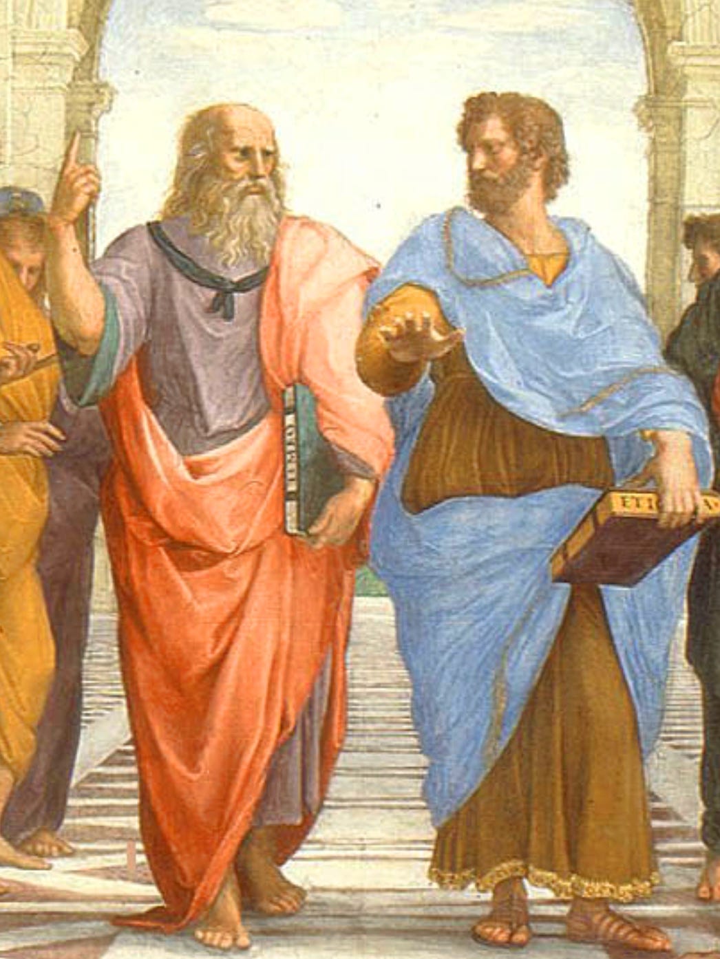 Aristóteles, sosteniendo la Ética a Nicómaco: un manual para la vida dedicado (posiblemente) a su hijo, apunta con la palma hacia la tierra, al mundo de la experiencia.