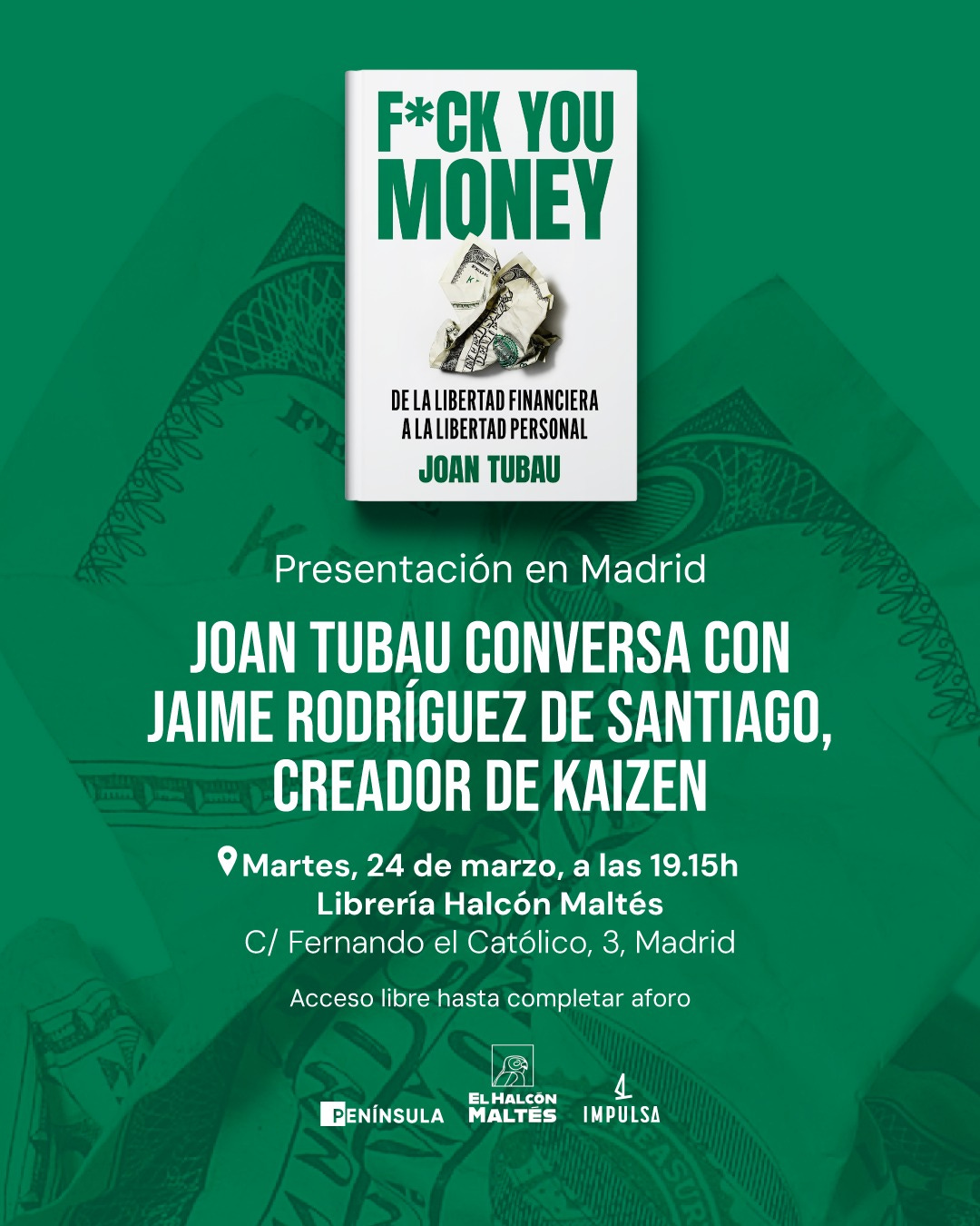 El próximo martes 24 de marzo a las 19:15 grabaremos un capítulo en directo con Joan Tubau para presentar en Madrid su libro: F*ck You Money.